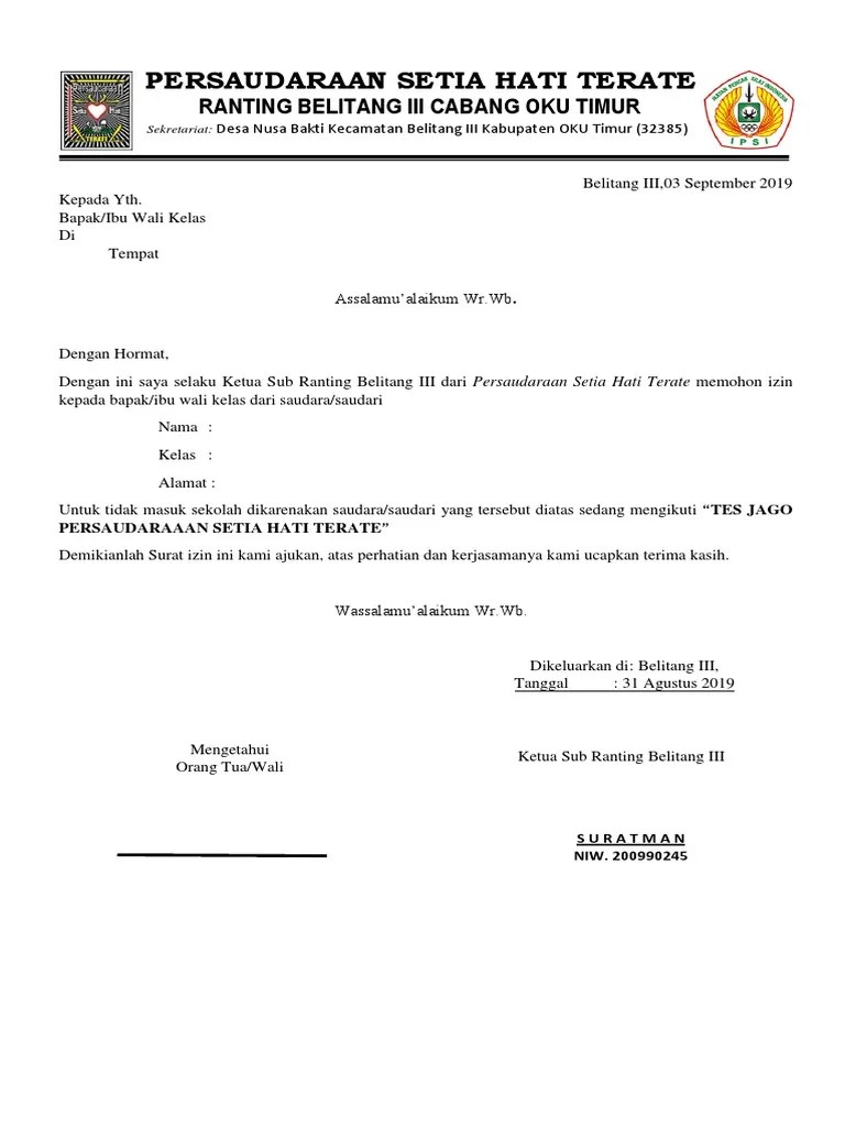 Surat Izin Sakit Latihan Psht / Contoh Surat Izin Sakit Siswa Psht Nusagates - Adapun bentuk latihan pencak silat persaudaraan setia hati terate psht ini berbentuk olah raga dan kerohanian dengan materi sebagai berikut.. Ukm pagar nusa uin malang dapatkan surat permohonan delegasi btc 5. Berikut yang dapat admin bagikan terkait contoh proposal pengajuan alat pencak silat psht. 09.02.2021 · cara membuat surat izin tidak masuk latihan psht bagi cute766 contoh surat izin sakit siswa psht contoh surat izin tidak masuk sekolah karena acara keluarga belajar office Contoh surat izin tidak masuk latihan psht karena sakit hati, contoh surat izin tidak masuk latihan psht karena sakit mata, contoh surat. Dalam rangka mengadakan kegiatan latihan bersama persaudaraan setia hati terate se cabang malang kami selaku ketua ukm bela diri unit psht …